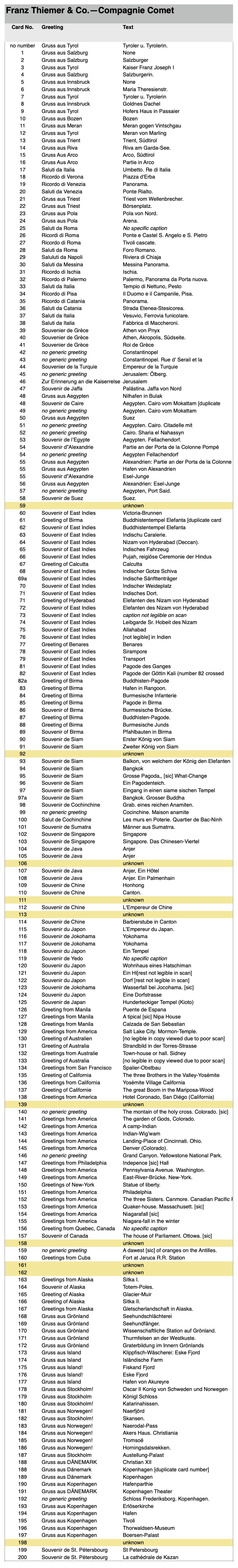 Franz Thiemer & Co. of Dresden, Germany, published a series of more than 200 pioneer postcards under the name of his business, Compagnie Comet, featuring coloured halftone scenes from around the world, including Canada, dating from about 1897 to 1900. This posting includes an attempt to catalog the cards currently identified in this series. Note that, due to numerous printing and proofing errors, multiple cards exist with the same number but different illustrations, or cards with a number and a letter “a” added after the number. Some cards exist with coloured card stock and white cardstock. Cards commonly exist with and without the stamped Franz Thiemer signature.